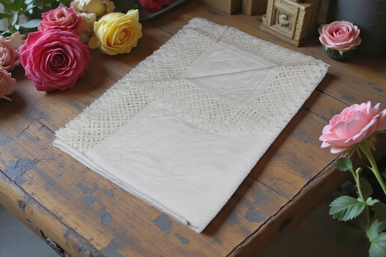 Pe margine este aplicată o dantelă împletită de 7,5 cm.